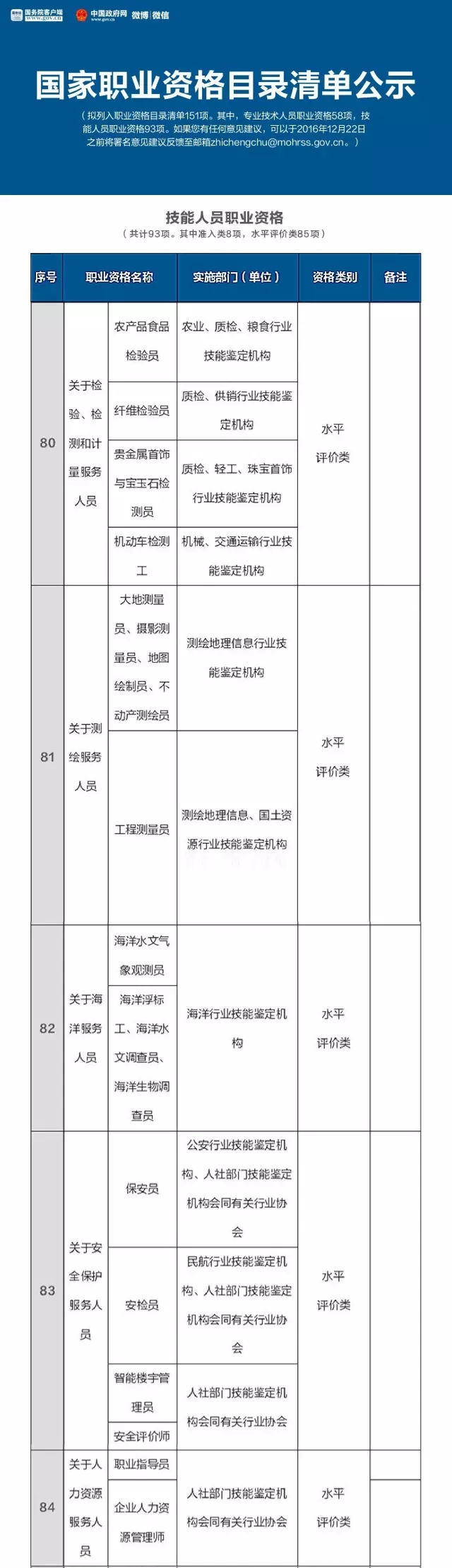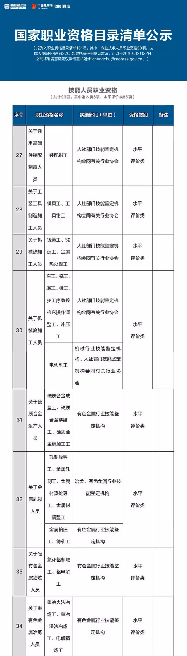 12月16日,人力资源和社会保障部公示了国家职业资格目录清单,拟列入职业资格目录清单151项。其中,专业技术人员职业资格58项,技能人员职业资格93项。
